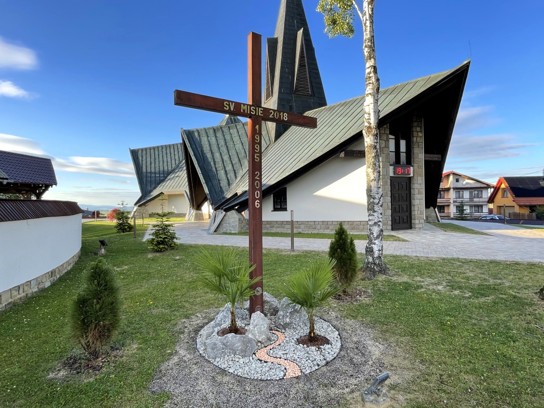 Misijný kríž pred kostolom sv. Cyrila a Metoda zdobí nová skalka. Veľké skaly pripomínajú Golgotu – miesto ukrižovania Pána Ježiša. Spod kríža vyteká prameň Kristovej krvi. Ako napísal prorok Ezechiel (47 kapitola), je to prameň, ktorý vyteká z pravej strany chrámu, postupne mohutnie a všetko oživuje. Palmy sú symbolom Kristovho víťazstva, vzkriesenia a večného života. Okrem toho pripomínajú slová proroka Ezechiela, ktorý píše, že na oboch stranách rieky života rastú stromy plné ovocia, ktorých lístie nikdy nevädne.