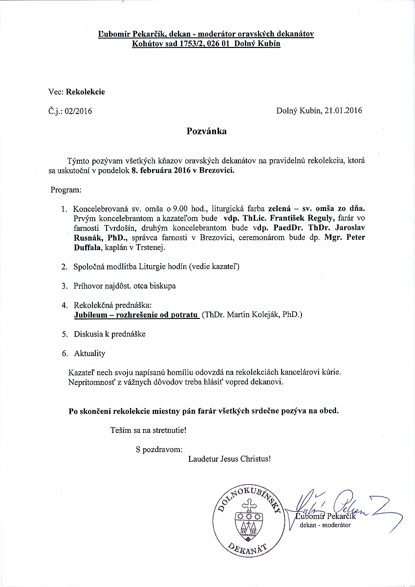 Dňa 8. 2. 2016 sa konali v roku Božieho milosrdenstva v našej farnosti už druhý krát po piatich rokoch kňazské rekolekcie. Kňazské rekolekcie je pracovné stretnutie kňazov so svojím otcom biskupom. Stretnutie sa začína liturgiou, ktorá je kňazom najvlastnejšia - ako to zdôraznil otec biskup Štefan - teda svätou omšou. Stretnutie je podľa Kódexu kánonického práva pravidelné a to štyri krát do roka. Pravidelne sa stretávame na rekolekciách v pastoračnom centre na Ústi, ale v rámci životného jubilea miestneho farára sa konali vo farnosti Brezovica. Otec biskup prijal naše pozvanie spolu so 68 kňazmi nášho oravského regiónu. Keď sme ako farnosť boli na púti 1. 6. 2015 v mariánskej svätyni na levočskej hore, navštívili sme aj na Spišskej kapitule otca biskupa Štefana a pozvali sme ho na náš odpust. Keďže je pravidelná spoločná účasť našich biskupov nevyhnutná na slovenskej púti slovanských vierozvestcov sv. Cyrila a Metoda v Nitre, otec biskup prisľúbil, že príde v iný sviatok sv. Cyrila a Metoda ako patrónov Európy. Túto spomienku v liturgickom kalendári máme stanovenú na 14.2. Tento sľub splnil a prišiel medzi nás. Predsedal liturgii sv. omše. Pracovné stretnutie pokračovalo v Teplici. Body stretnutia si môžete prečítať na pozvánke, ktorá je prílohou v tomto článku ako ostatné obrázky. Za dôstojnú prípravu a jej priebeh sa chcem poďakovať mojim farníkom, pani riaditeľke ZŠ, že umožnila deťom - žiakom zúčastniť sa sv. omše, mojim kostolníkom p. Milanovi a p. Evke, môjmu kantorovi Andrejovi, kvetinárke pani Marte, vedúcej potravín pani Jendráškovej, pani Vierke Pakosovej, pani Polomke, predávačke Andrei a študentke Ivanke, vedeniu hotela Teplica, žiakom a aj veriacim, ktorí akýmkoľvek spôsobom pomohli k dôstojnému priebehu týchto kňazských rekolekcií.