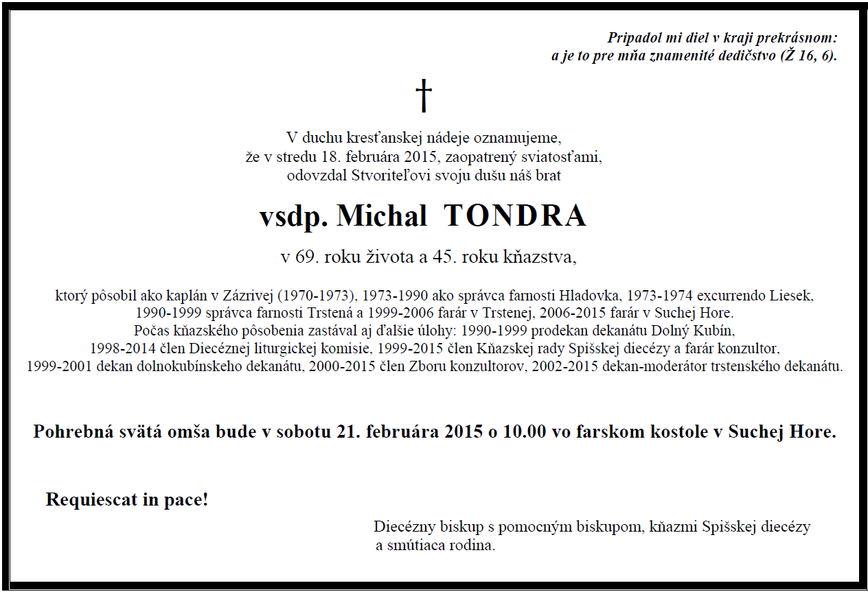 Dňa 18. 2. 2015 nás predišiel do večnosti pán dekan Michal Tondra vo veku 69. rokov. Jeho pôsobenie nájdeme na priloženom smútočnom oznámení k tomuto článku. Farnosť Brezovica sa pripája v žiali a vyslovuje úprimnú sústrasť smútiacej rodine. Odpočinutie večné daj mu Pane a svetlo večné nech mu svieti, nech odpočíva v pokoji.