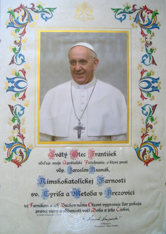 V nedeľu 16. 3. 2014 som našej farnosti predstavil a aj posvätil požehnanie sv. otca Františka, ktoré nám udelil z večného mesta Ríma. Veriacich mojej farnosti som oboznámil o tomto požehnaní, na ktorom je pečiatka a podpis pápežského ceremonára, arcibiskupa Konráda Krajewského. Toto požehnanie svätého otca, o ktoré som požiadal Apoštolskú administratúru, nech prinesie našej farnosti milosti prúdiace z Apoštolského Stolca sv. Petra.